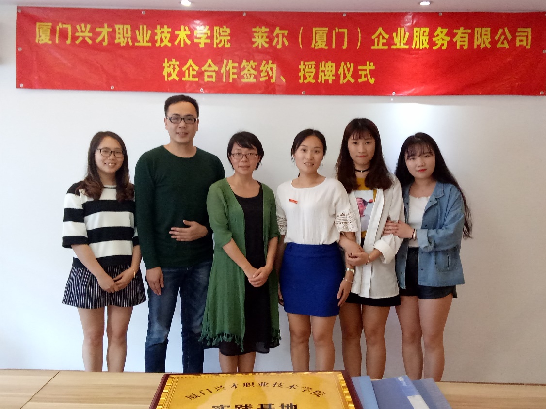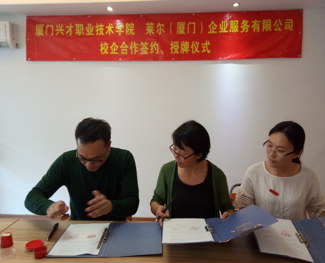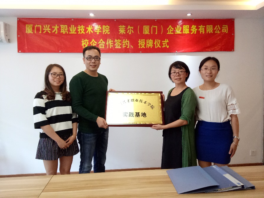 隨后,彭曉娟副院長與萊爾(廈門)企業服務有限公司總經理王志陽先生在公司會議室簽署了校企合作協議,并授予公司“廈門興才職業技術學院實踐基地”的牌匾。