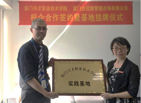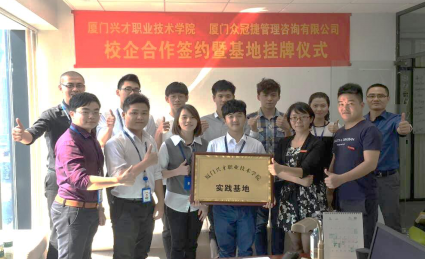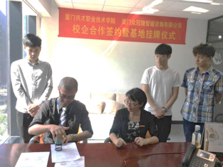 隨后,彭曉娟副院長與廈門眾冠捷管理咨詢有限公司總經理王子杰先生簽署了校企合作協議,并授予公司“廈門興才職業技術學院實踐基地”的牌匾。參觀企業的師生、在公司頂崗實習的同學們共同分享和見證了這一歡樂場面。自此,我院市場營銷專業的學子們又多了一個社會實踐、實習實訓的平臺啦!